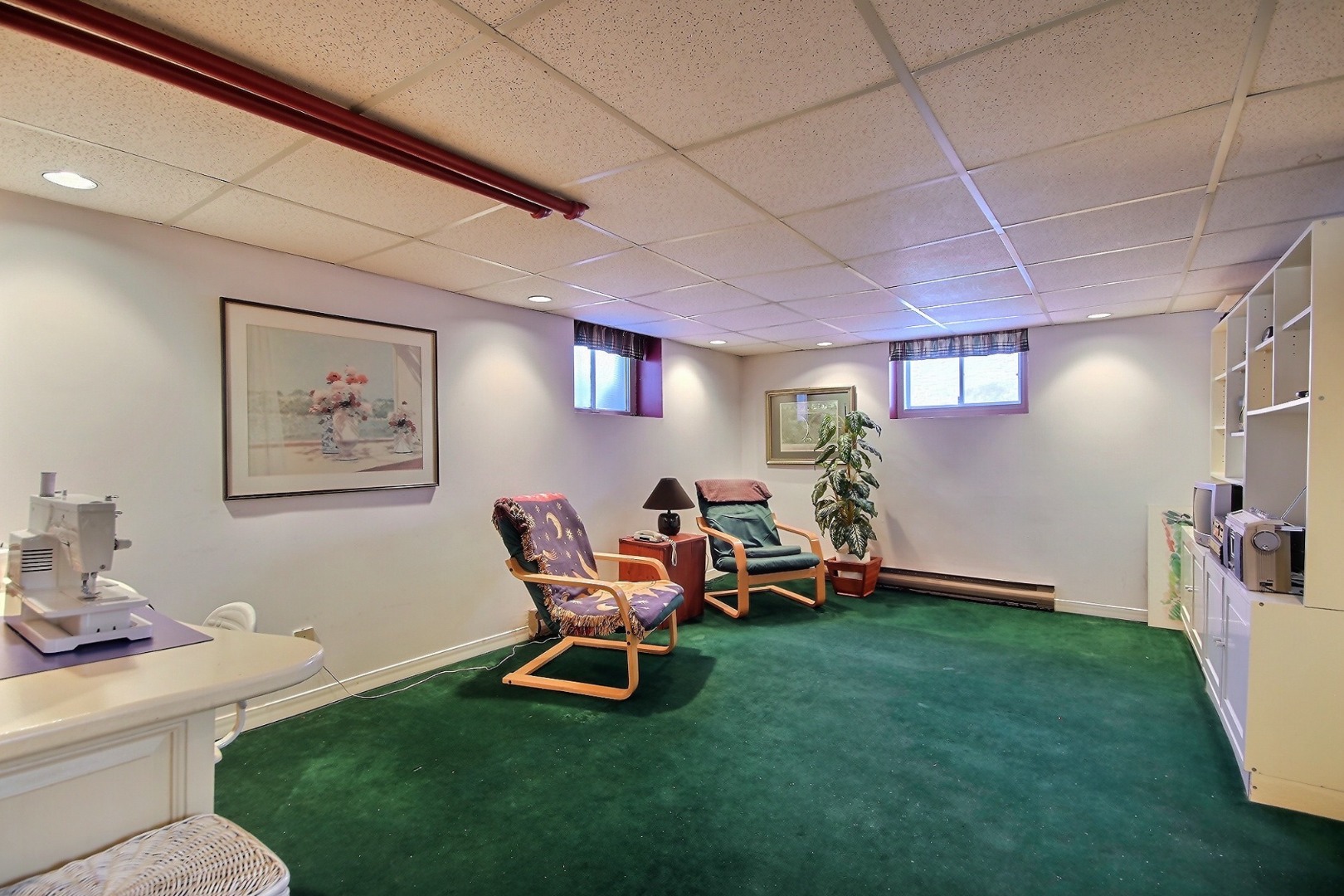 | Cuisinière, stores, rideaux, luminaires en place, système d'alarme, bureau blanc au sous sol |